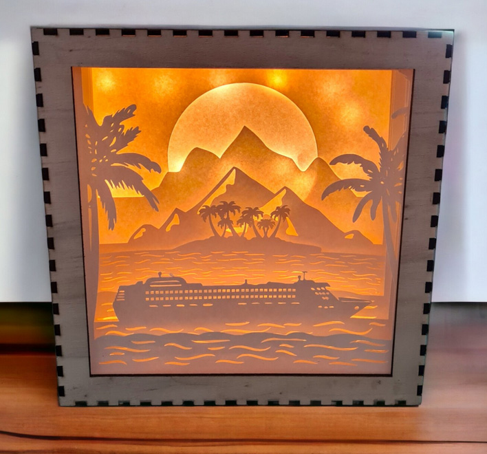 ![]() 3 Wise Men – 8×8, black or white frame. | ![]() Pagoda – 8×10 in either black or white frame. 9 Layers with lights. $25.00 | ![]() Cruise Ship – 8×8, black or white frame. 8 Layers with lights. $25.00 |