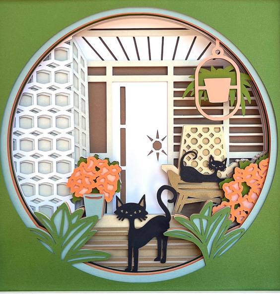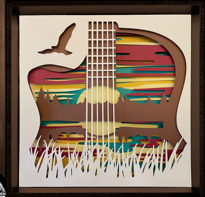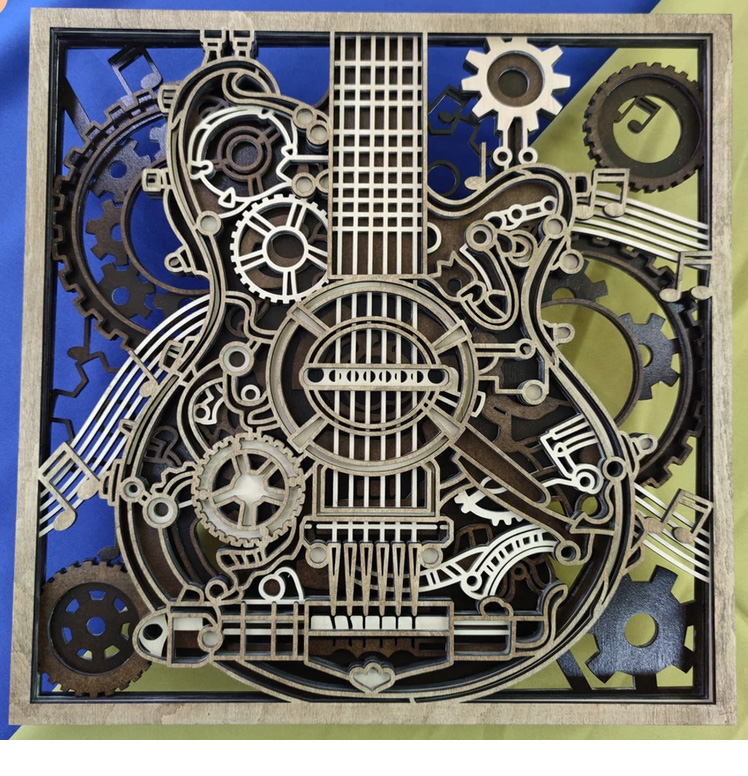 ![]() Guitar w/music – 8×8, black or white frame. 10 layers with lights. $25.00 | ![]() Guitar w/gears – 8×8, black or white frame. 4 layers, no lights. $22.50 | ![]() Boho cat on porch – 8×8, black or white frame. 14 layers, no lights. $22.50 |