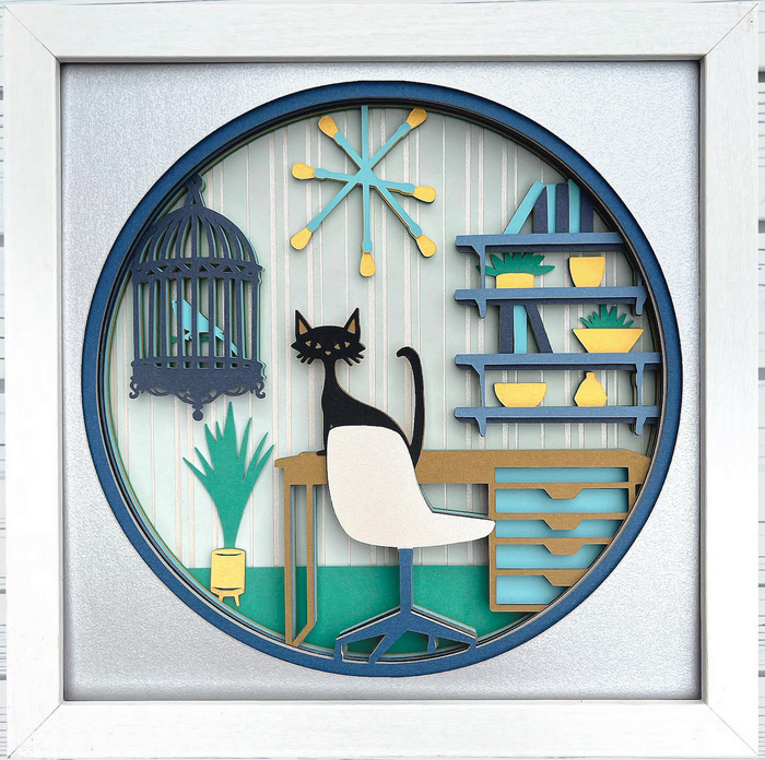 ![]() Boho cat in office – 8×8, black or white frame. 14 layers, no lights. $22.50 | ![]() Guitar w/sunset – 8×8, black or white frame. 6 layers, no lights. $22.50 | ![]() Cat w/Moon – 8×8, black or white frame. 8 layers, with lights. $25.00 |